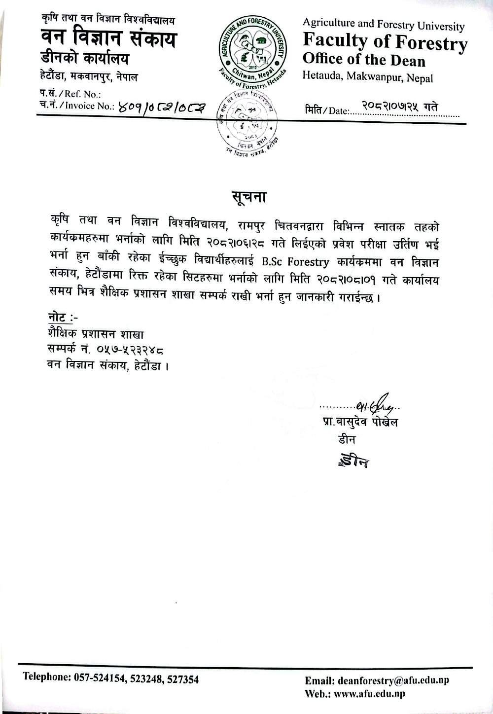 B. Sc. Forestry कार्यक्रमका रिक्त रहेका सिटहरु मा भर्ना हुन बाँकि रहेका विद्यार्थीहरुको लागि सूचना