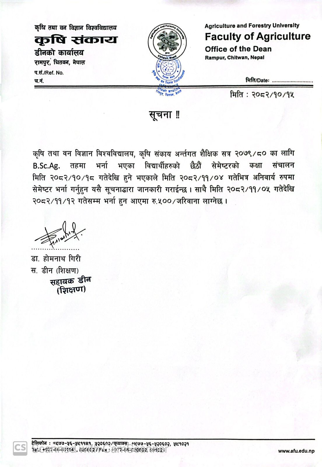 Class start and admission notice-b.sc.ag 6th semester academic year 2079/080