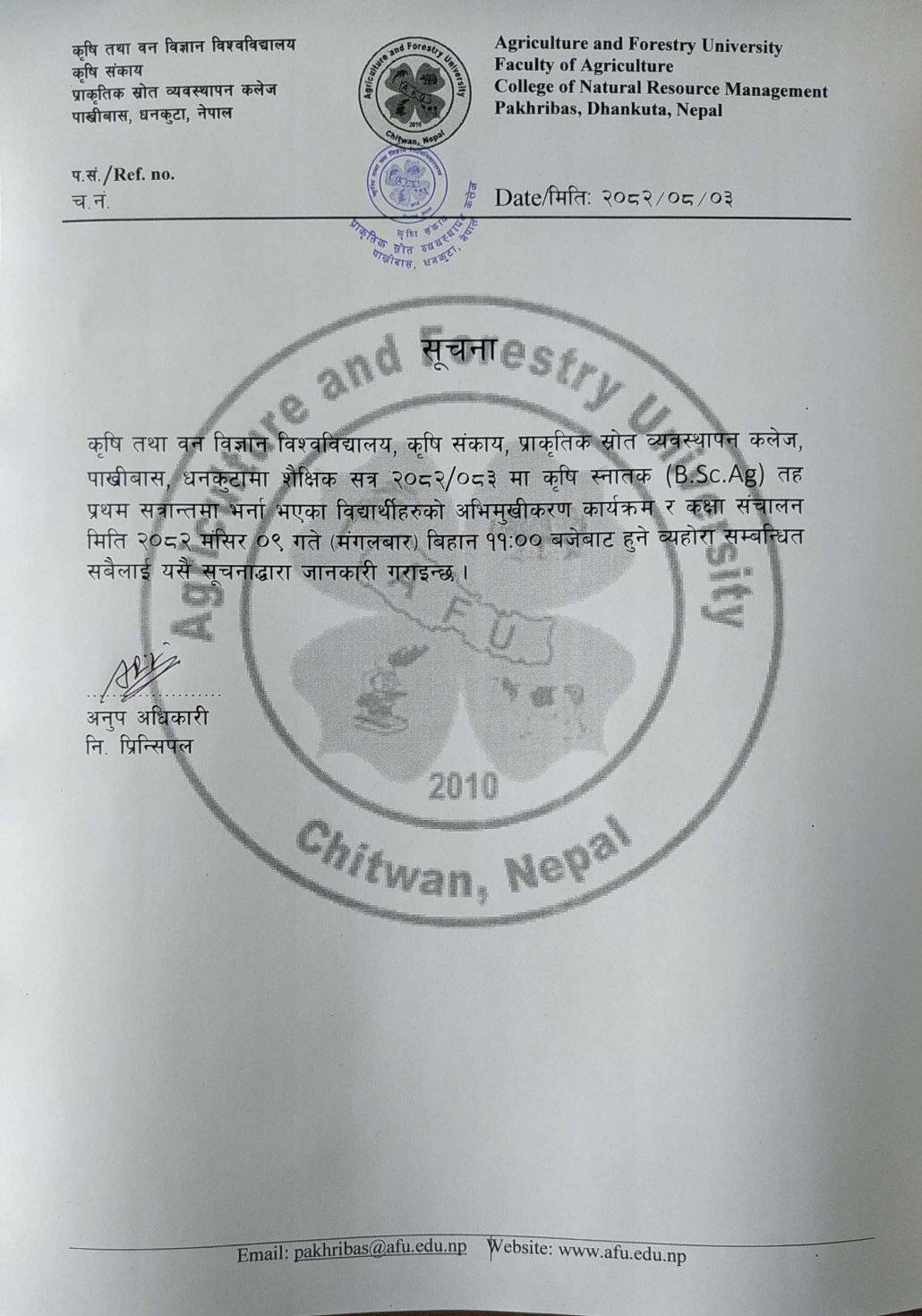 CNRM - Pakhribas, B.Sc. Ag 1st sem Orientation Notice