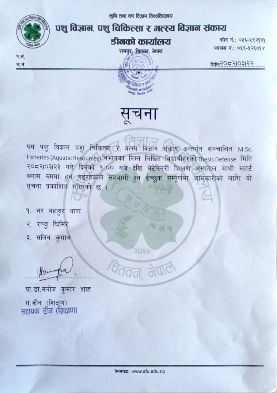 FAVF- Notice regarding Thesis Defense of M.Sc. Fisheries(Aquatic Resource)