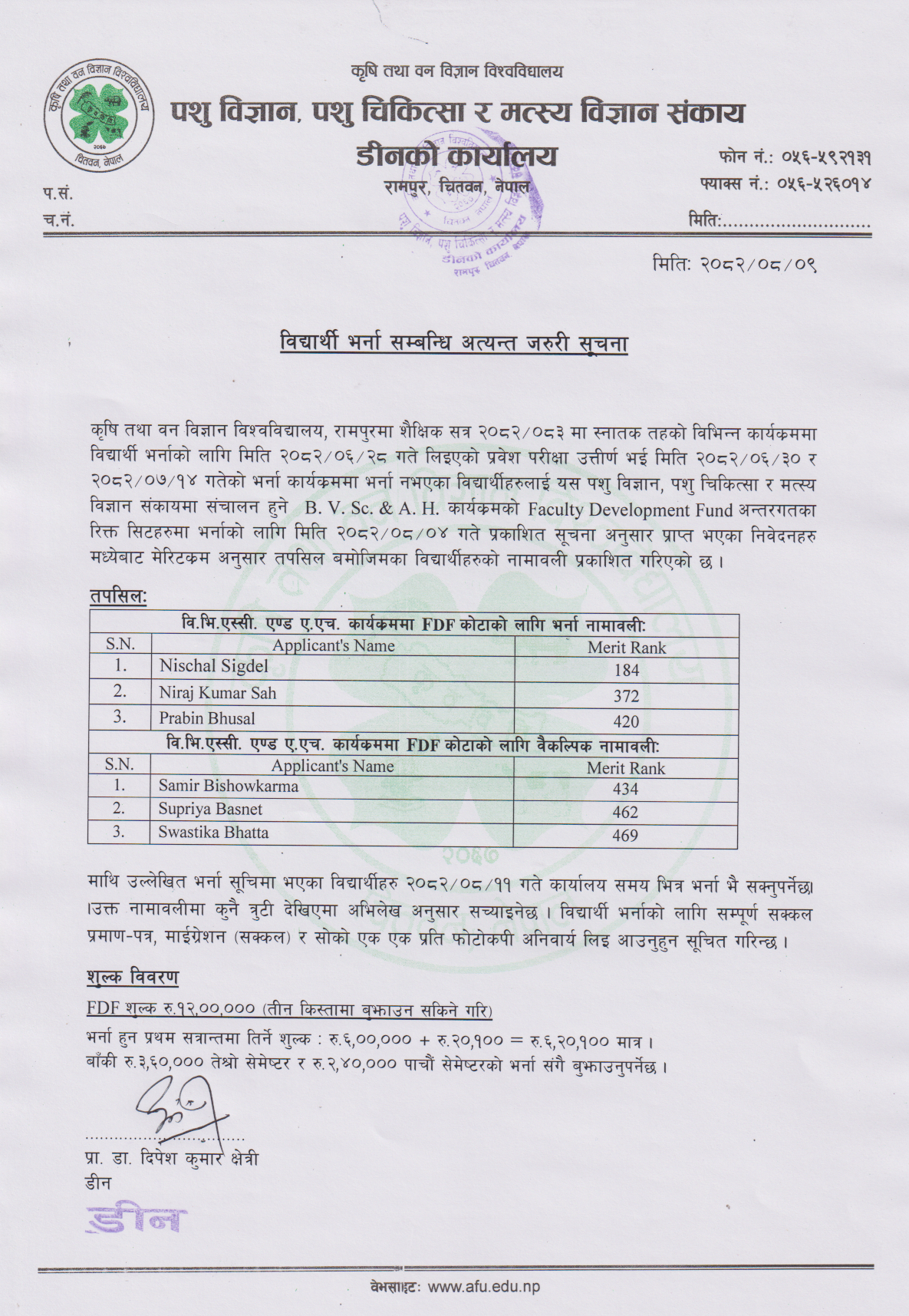 FAVF - विद्यार्थी भर्ना सम्बन्धी अत्यन्त जरूरी सूचना