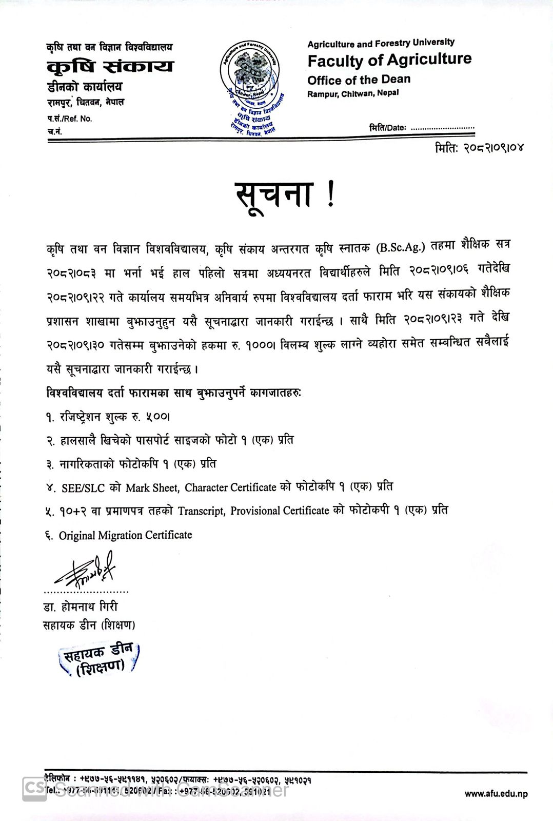 FoA - AFU registration B. Sc. Ag 1st semester