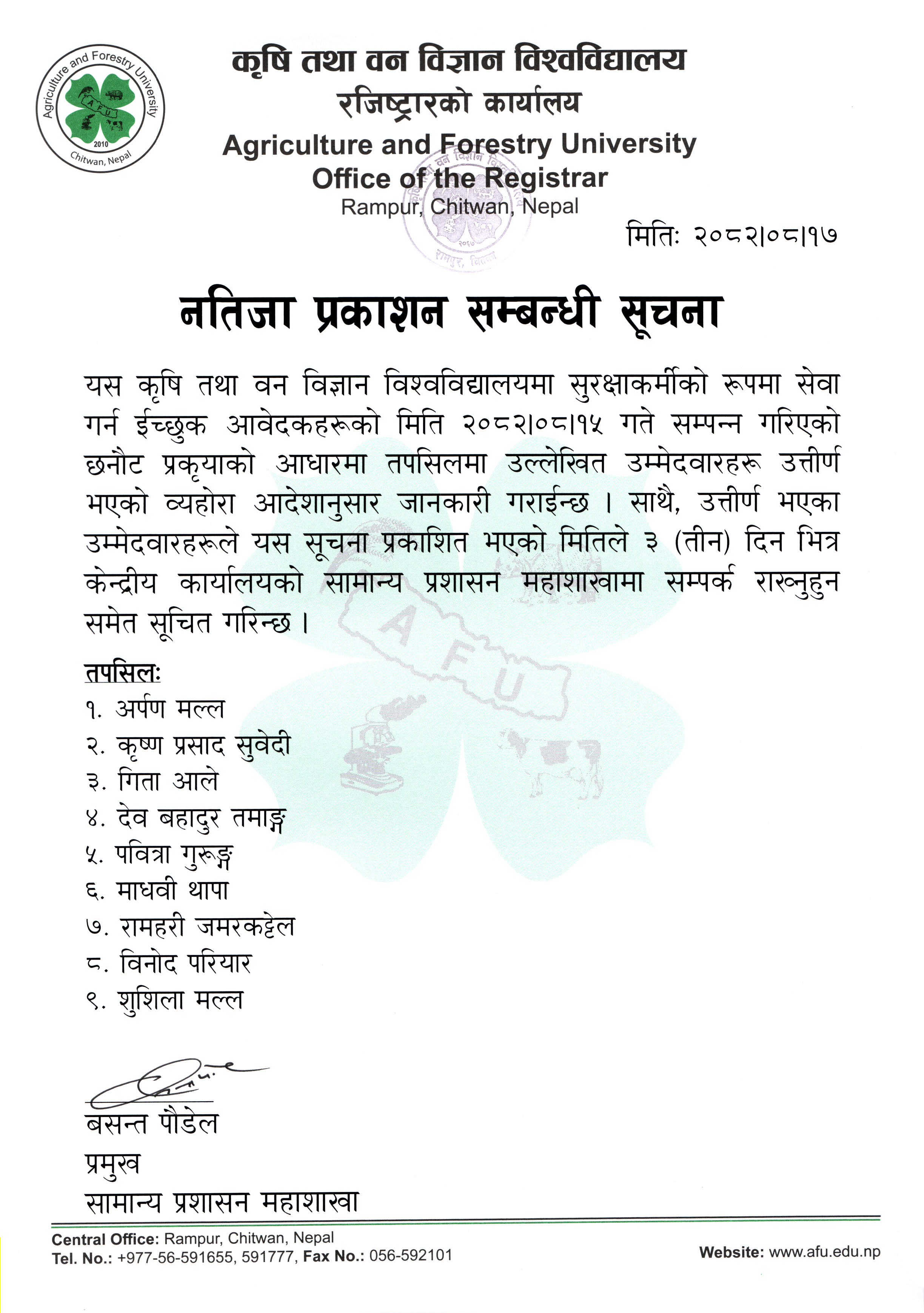 नतिजा प्रकाशन सम्बन्धी सूचना