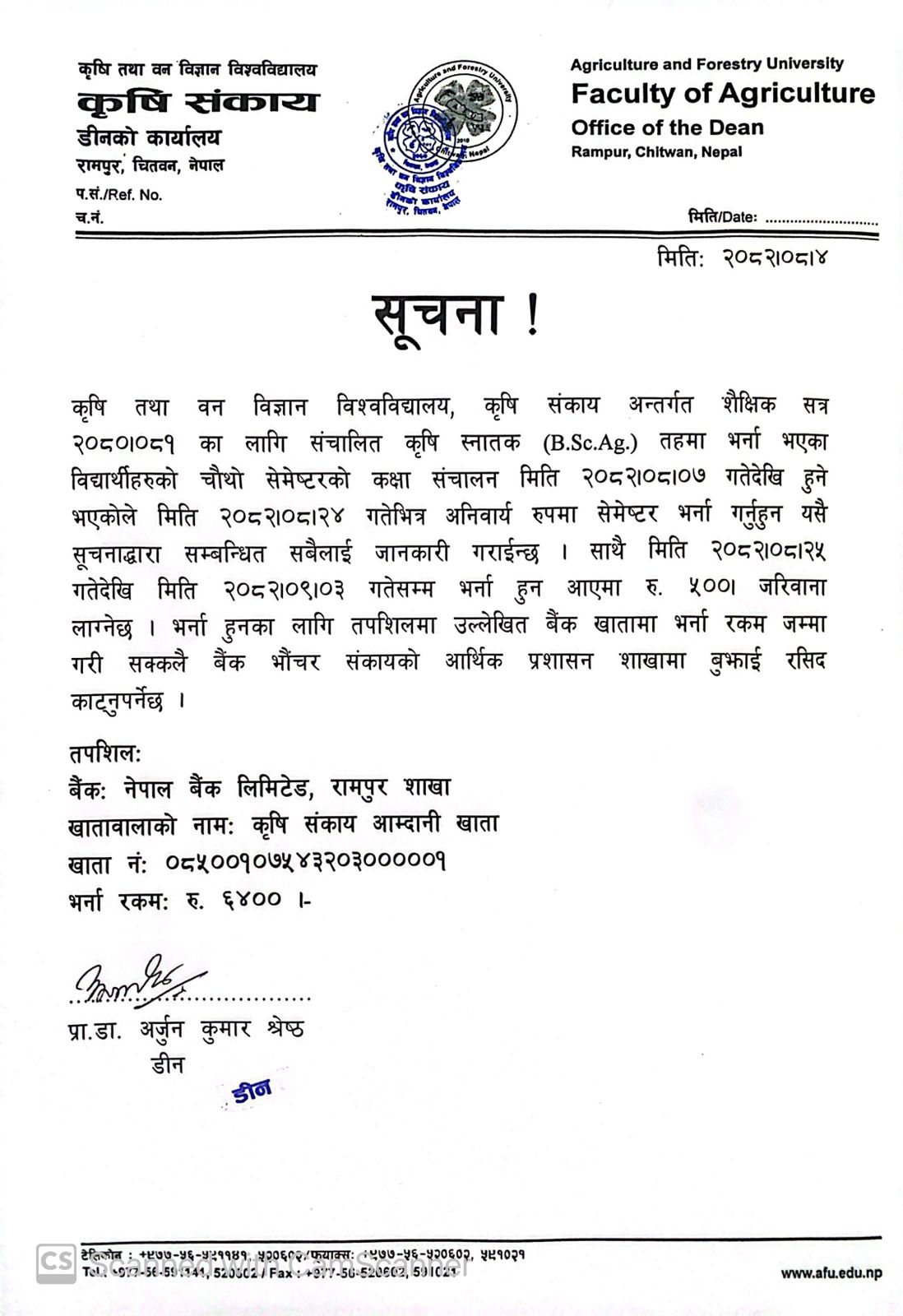 Notice Regarding the Start of Classes and Admission for B.Sc. Agriculture 4th Semester